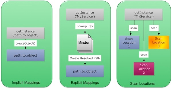 A partial instantiation path(s) or folder(s) are mapped so you can retrieve by shorthand names. Very quick to prototype also without using full instantiation paths. Override of implementations can be easily done by discovery.