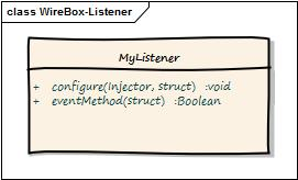 If you are running WireBox within a ColdBox application, listeners are Interceptors and you declare them and register them the same way you do with normal interceptors.